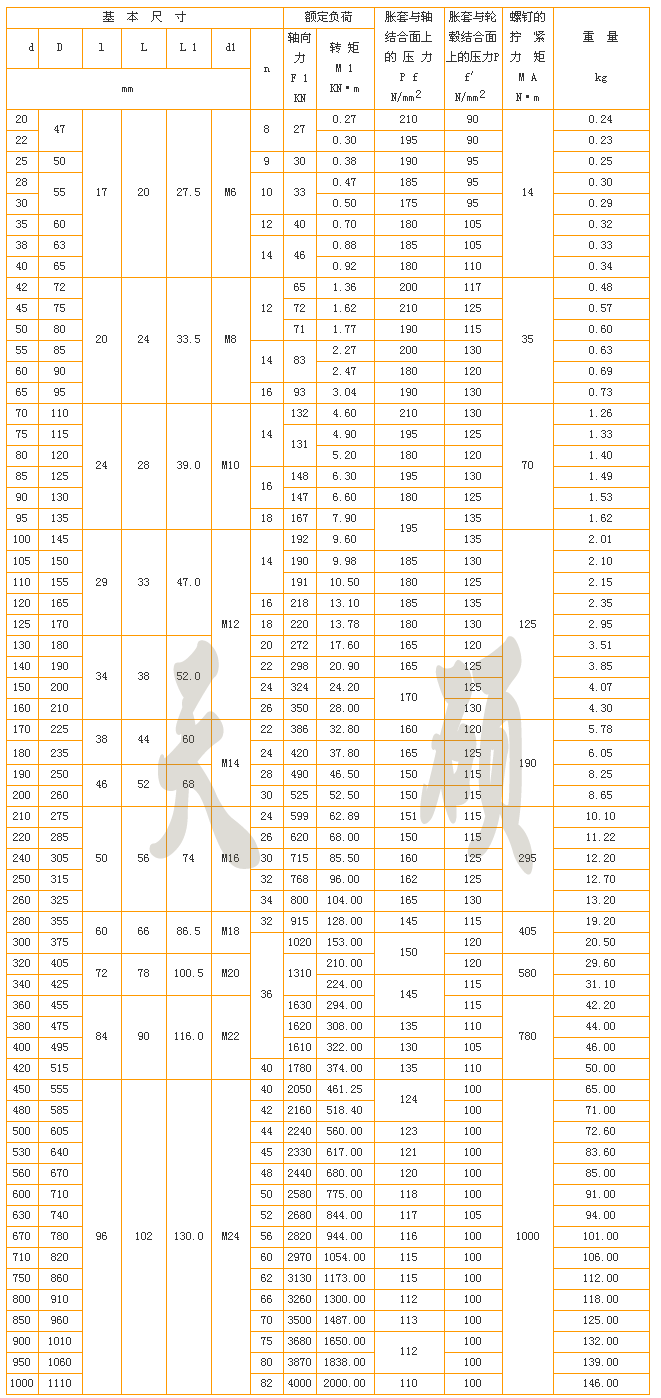 特性:Z2型脹緊套由一個開口的雙錐內環,一個開口的雙錐外環和兩個雙錐壓緊環組成。用內六角螺栓擰緊,擰緊時彈性環沒有相對于軸轂的軸向移動,與Z1型比較,同樣壓緊力能產生更大的徑向壓力,傳遞更大的載荷。為便于拆卸,在一個壓緊環上有拆卸用螺孔,沿圓周共有2~4處。鎖緊聯結盤廣泛應用于包裝、印刷、紡織、機床等機械上。 標記示例: 安裝參考范例 |